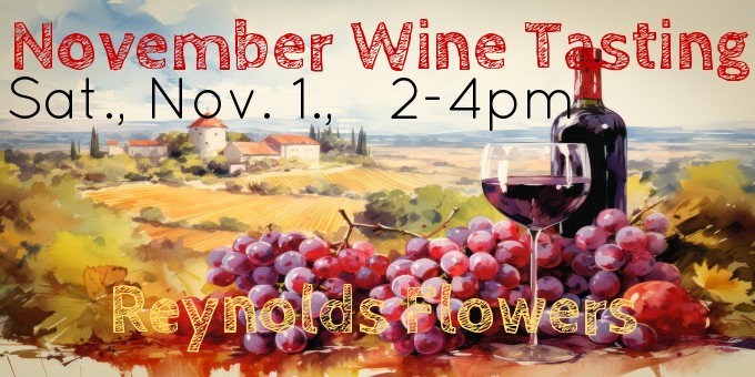 Don’t miss this exclusive wine tasting event at Reynolds Flowers – mark your calendar for Saturday, November 1, 2-4 PM, and treat yourself to an afternoon of great wine, festive fun, and local charm.