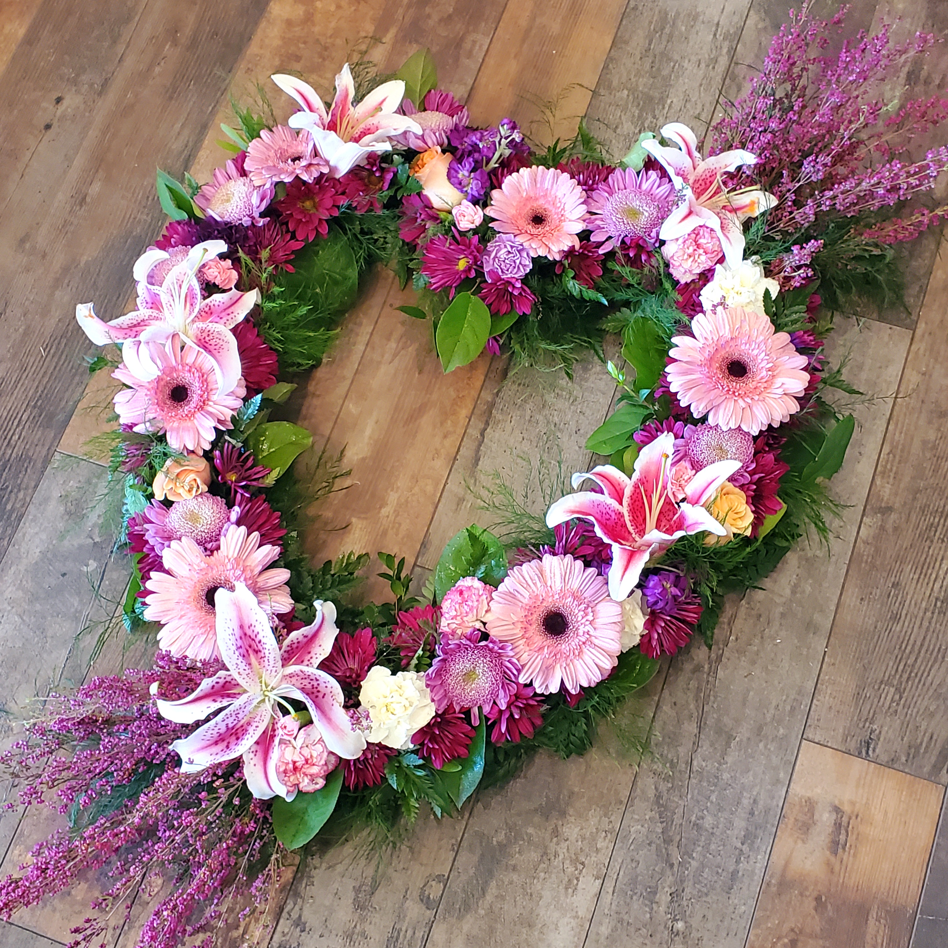 Standing floral hearts symbolize enduring love and devotion. Designed with roses, carnations, and seasonal blooms, they are often chosen by immediate family members to honor a beloved spouse, parent, or grandparent.
